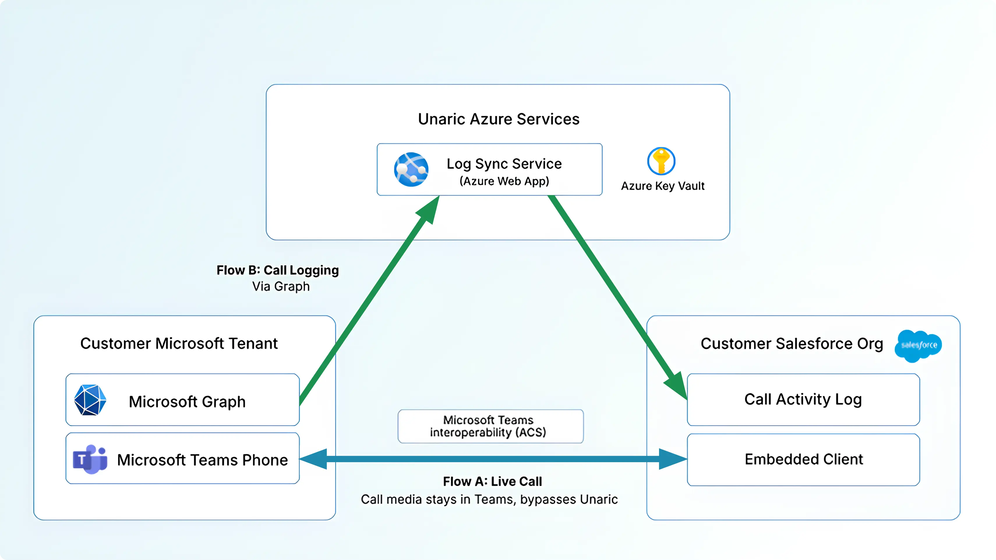 Unaric Voice is built around a simple architecture: Microsoft Teams remains the calling environment, Salesforce remains the system of record for activity, and Unaric connects the two without sitting in the live audio path.